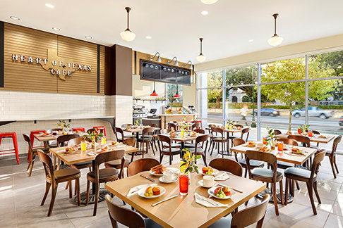 Das Erdgeschoss der neuesten Idealen Org im Lone Star State erstrahlt mit deckenhohen Fenstern und heißt die über 70.000 Menschen, die jeden Tag durch The Drag schlendern, auf freundliche texanische Weise willkommen.